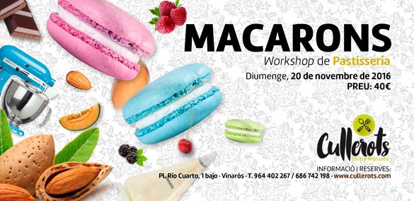 Delicats, menuts i deliciosos! Pot ser que no tingueu la més xicoteta idea d’elaborar aquest dolç d’origen francès, però la seua fama els precedeix i potser sentireu pànic d’enfrontar-vos-hi tots sols. Moltes ametlles, moltes ganes i una precisió mil·limètrica són els ingredients principals. Aprendreu l’elaboració, el farcit i la decoració dels vostres macarons d’una forma amena i entretinguda. Com és el taller? Aquest és […]